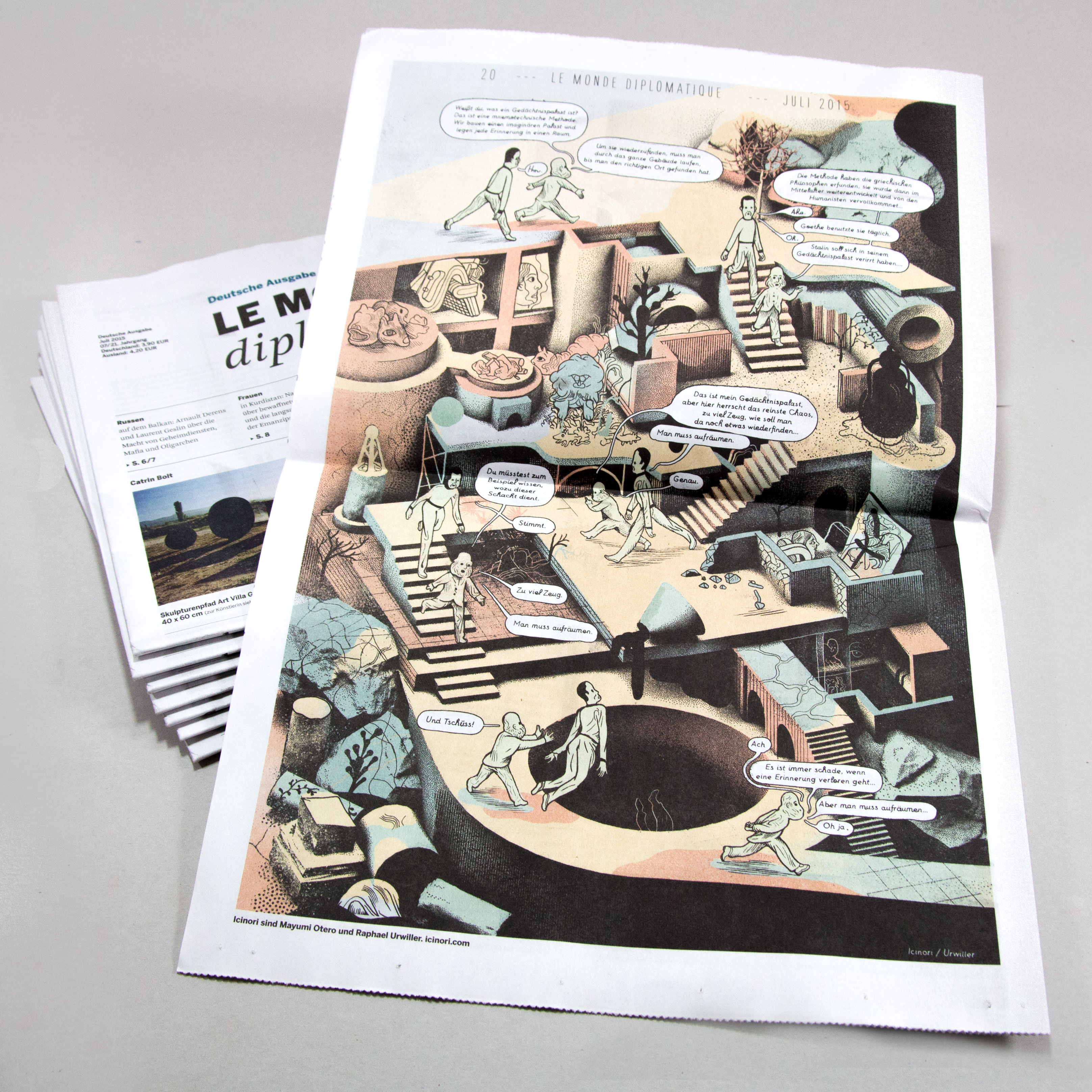 Two guys are walking through a memory palace – the page of the newspaper become an architecture, a reference to Winsor McCay and his incredible « Little Nemo ».
