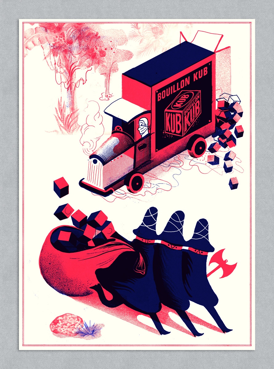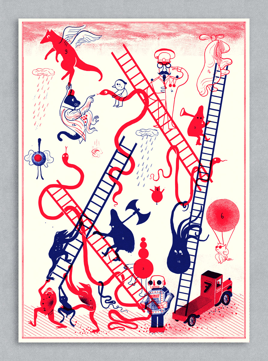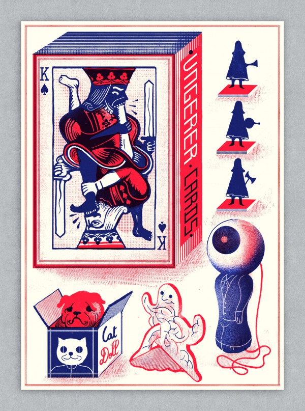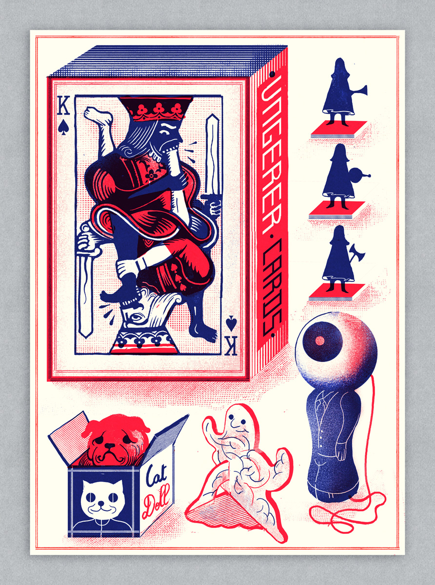 We realized and printed 4 Risographs for Tomi Ungerer’s toys exhibition at Tomi Ungerer’s Museum in Strasbourg.