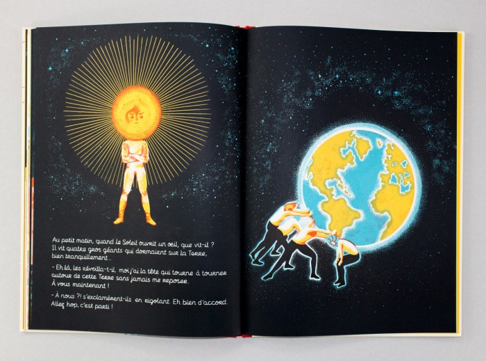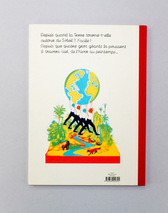 Un soir de lune grise, 4 géants entreprennent un grand voyage. Arrivés à destination, ils évaluent les lieux : c’est petit, c’est rond, c’est bleu, ça tourne tout doucement, et ça sent bon… Les quatre géants s’installent. Le premier prend l’eau, le second le feu, le troisième la terre, et le dernier l’air. À leur réveil, le Soleil, fatigué de tourner autour de la Terre, les défie de le remplacer. Depuis, quatre gros géants poussent la Terre à travers ciel, de l’hiver au printemps.