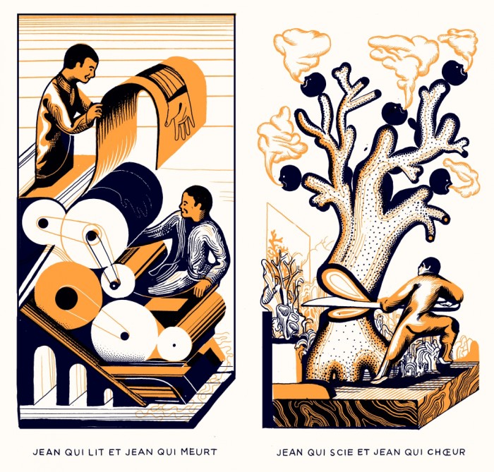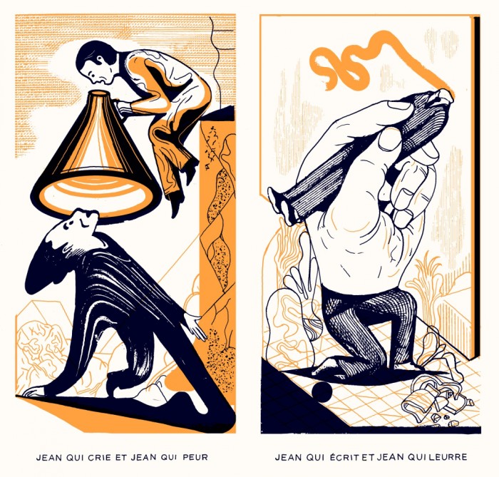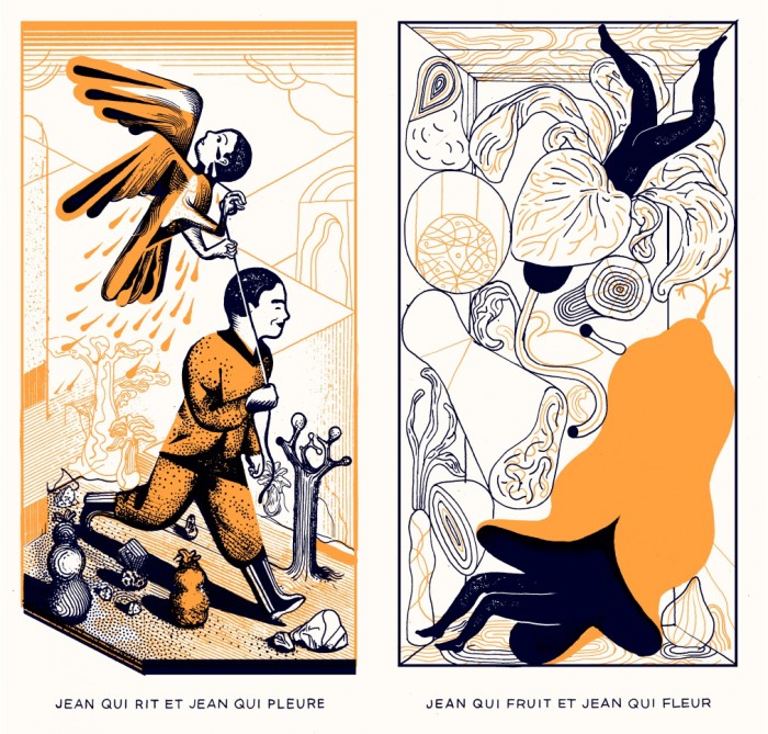 A book on 6 rhymes, derived from french playtime songs «Jean qui rit et Jean qui pleure»